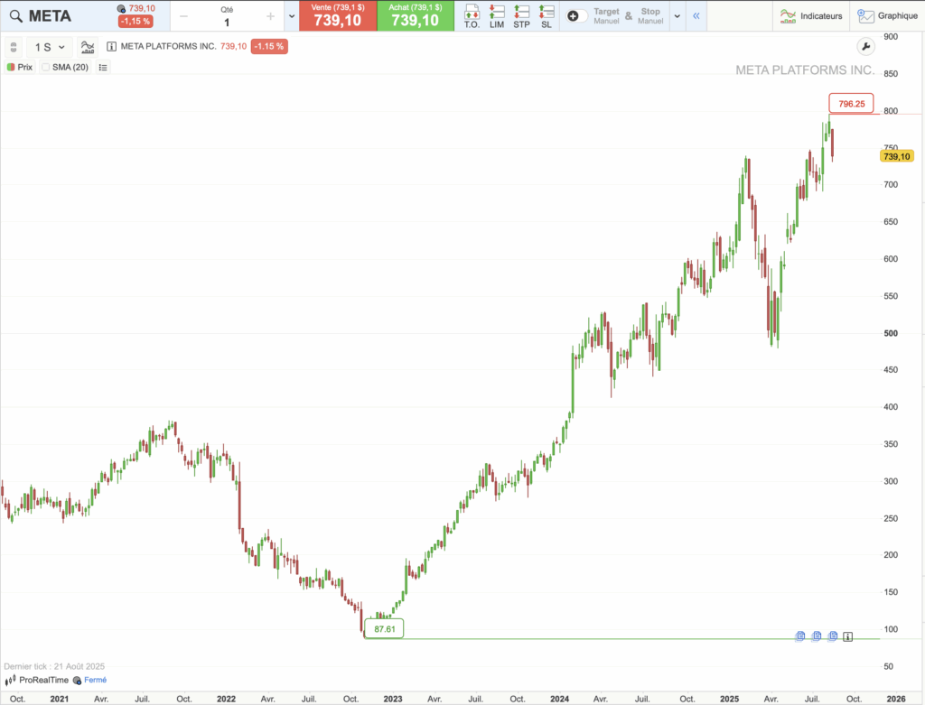 Depuis octobre 2022, le cours de Meta est passé de 87$ à près de 800$.