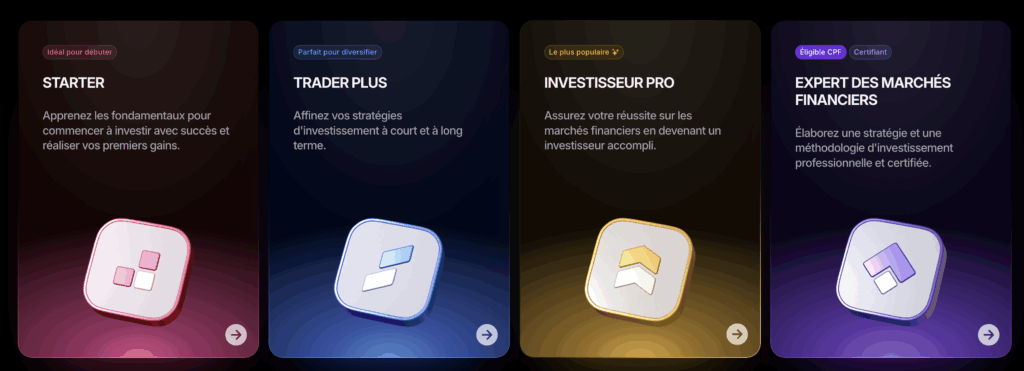 | formation | STARTER | TRADER RENTABLE | INVESTISSEUR PRO | EXPERT DES MARCHÉS FINANCIERS |