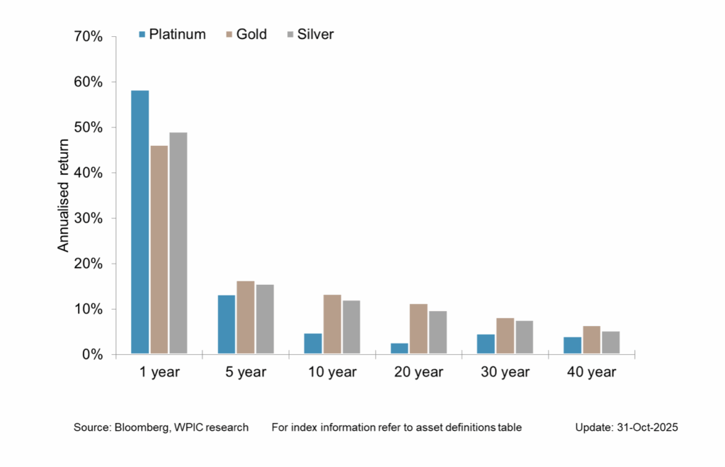 Si le platine surpasse les belles performances de ses concurrents sur 1 an, l’analyse est bien différente à plus long terme. La lecture de ce graphique nous permet de tirer les conclusions suivantes.